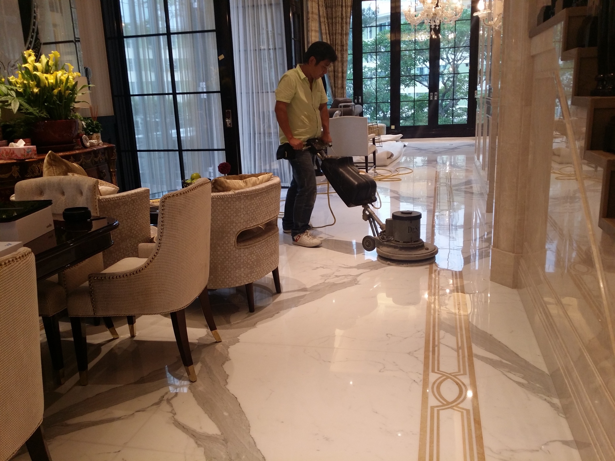 晶面處理:晶化後的雲石地面構成一片結晶層,能保護及有效地減慢地面磨損速度;